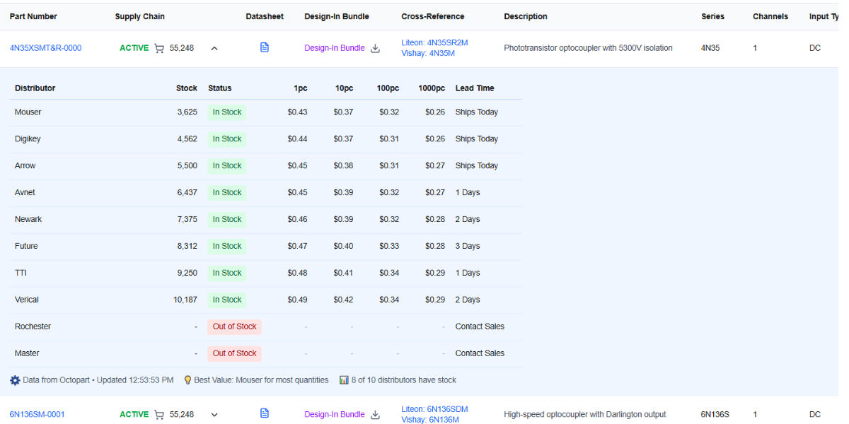 Partnership with Octopart provides real-time volume and pricing data. Designers see current inventory, lead times, and pricing across global distributors. Complete supply chain visibility—removing friction from the design and procurement decision.